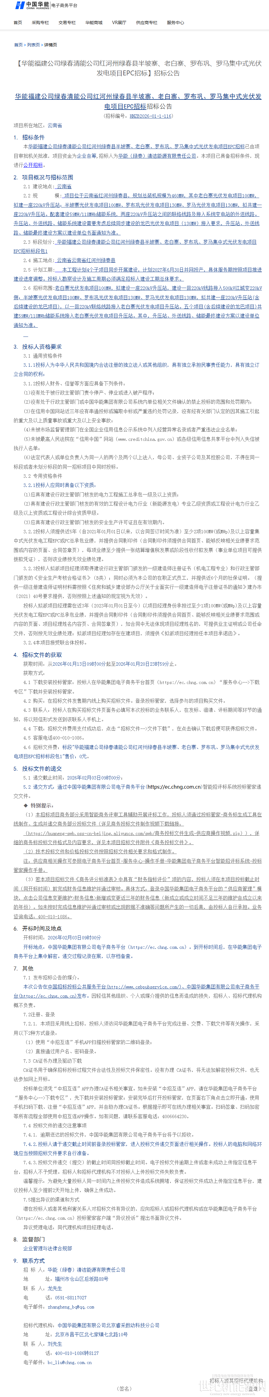 2月10日,华能福建公司绿春清能公司红河州绿春县半坡寨、老白寨、罗布巩、罗马集中式光伏发电项目EPC招标中标候选人公示。招标人为华能(绿春)清洁能源有限责任公司。
