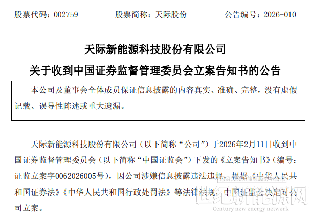 2月12日,天际股份公告披露,因涉嫌信息披露违法违规,公司已被中国证监会正式立案调查。