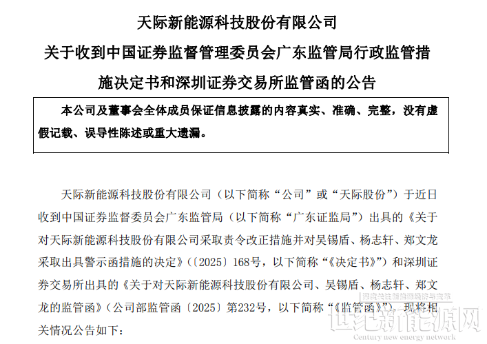 基于上述问题,广东证监局决定对天际股份采取责令改正的监管措施,同时对董事长兼总经理吴锡盾、财务总监杨志轩、董事会秘书郑文龙出具警示函。