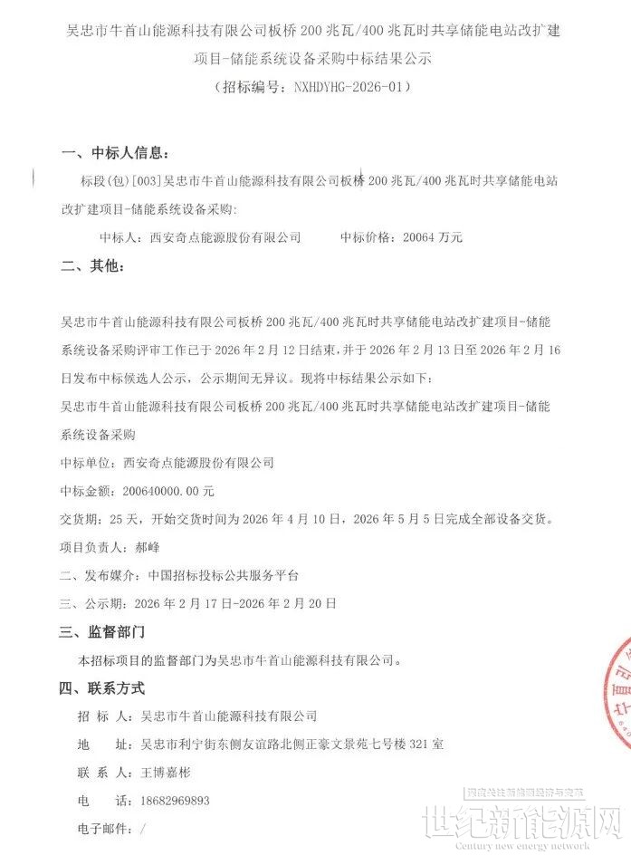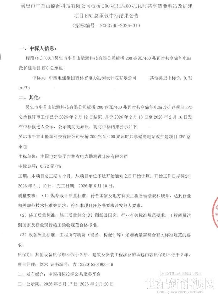 近日,吴忠市牛首山能源科技有限公司板桥200MW/400MWh共享储能电站改扩建项目EPC总承包及储能系统设备采购中标公示。