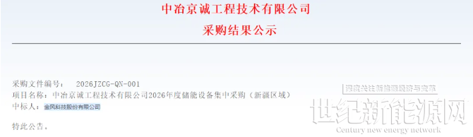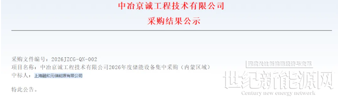 2月10日,中冶京诚发布2026年度储能设备集中采购(内蒙古区域、新疆区域)结果公示。内蒙古区域共采购电池舱/磷酸铁锂电池5GWh,该项目中标人为上海融和元储能源有限公司;新疆区域共采购电池舱/磷酸铁锂电池3GWh,该项目中标人为金风科技股份有限公司。