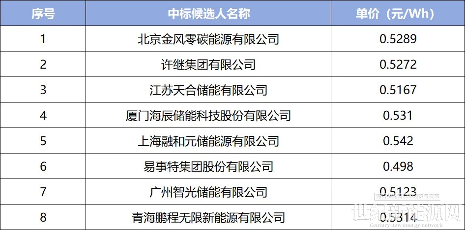 2月6日,北京疆来2026年度磷酸铁锂电化学储能系统设备集中采购供应商入围项目中标候选人公示,金风零碳、许继集团、天合储能、海辰储能、融和元储、易事特、智光储能、青海鹏程8家企业入围,中标单价范围在0.498~0.542元/Wh。