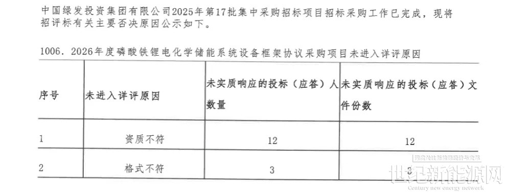 1月6日,中国绿发投资集团2026年度磷酸铁锂电化学储能系统集采的中标候选人,山东电工时代、中车株洲所、许继电科储能、比亚迪、阳光电源、宁德时代6家企业入围。值得注意的是有15家企业未进入详评遭到否决,其中12家因资质不符未实质响应的投标(应答),3家企业因格式不符未实质响应的投标(应答)。