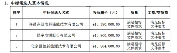 根据开标信息显示,共有12家储能企业参与投标,包括许继集团、平高储能、思源清能、电工时代、比亚迪储能、远信储能、许继电气、远景能源、中天储能、内蒙古中电储能、许昌许继电科、中车株洲所等,最终仅有3家入围。