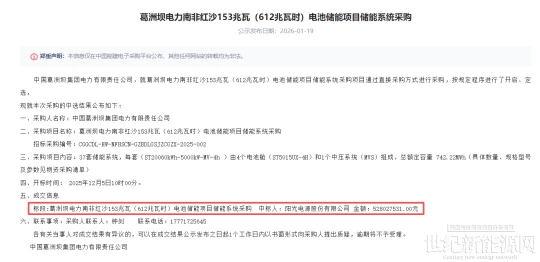 1月19日,葛洲坝电力南非红沙153MW(612MWh)电池储能项目储能系统采购中标结果发布。阳光电源股份有限公司中标,投标金额52802.75万元,折合单价0.863元/Wh。
