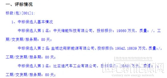 1月14日,启赫新能源河南宝丰200MW/400MWh储能电站项目EPC总承包储能系统设备成交候选人公示。中天储能科技有限公司、盐城达翔新能源有限公司、比亚迪汽车工业有限公司入围,投标报价0.4886~0.512元/Wh。