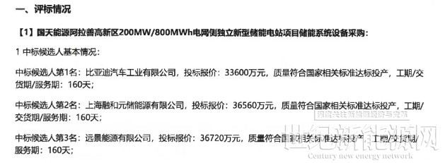 1月10日,国天能源阿拉善高新区200MW/800MWh电网侧独立新型储能电站项目储能系统设备采购中标候选人公示。比亚迪、融和元储、远景能源三家入围,投标报价在0.42~0.459元/Wh。