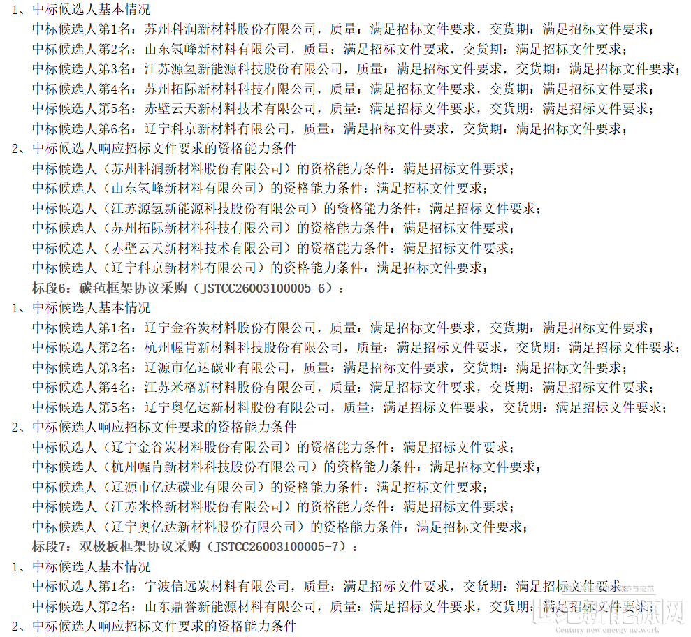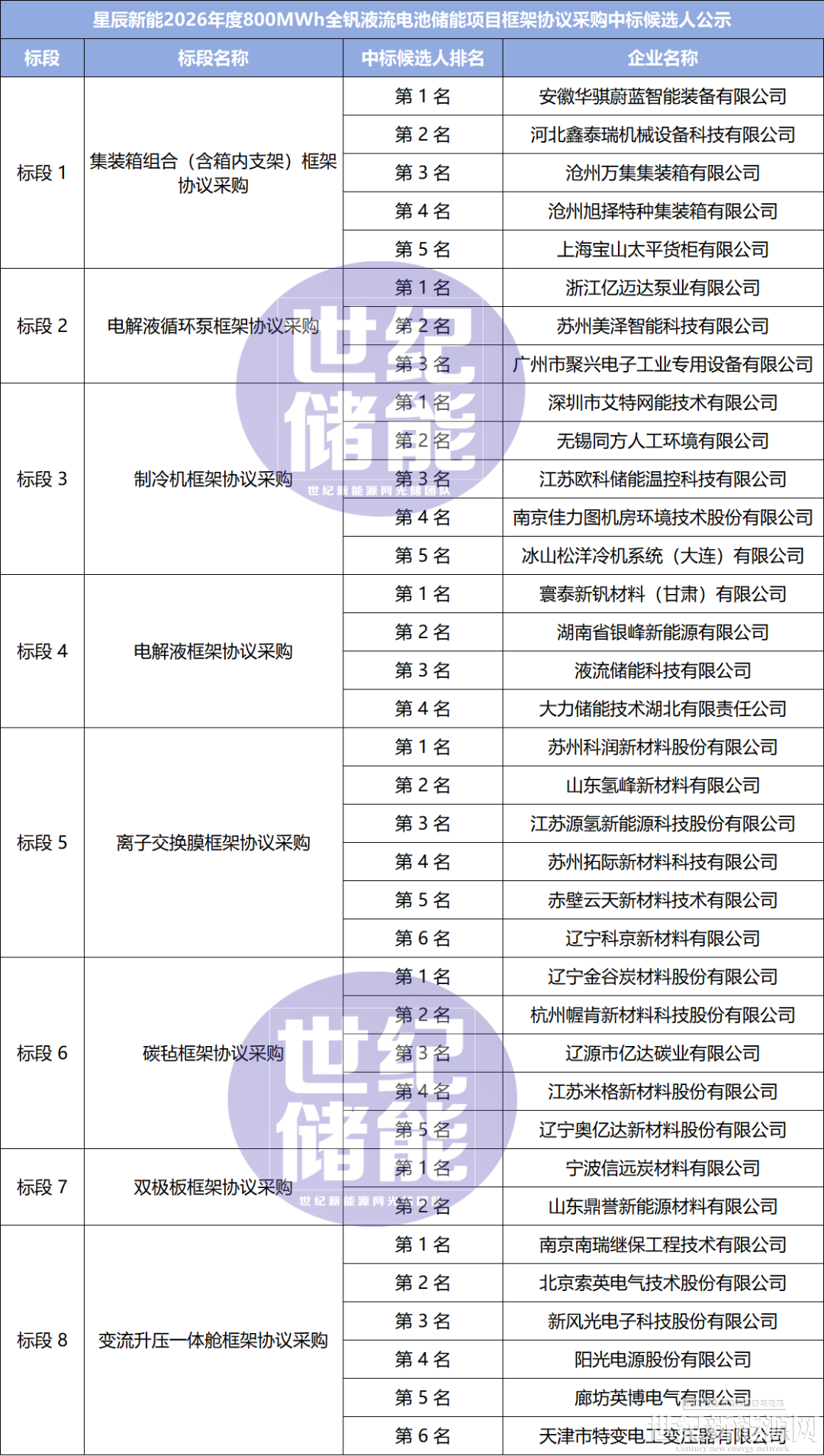 此次公示包含集装箱组合(含箱内支架)框架协议采购、电解液循环泵框架协议采购、制冷机框架协议采购、电解液框架协议采购、离子交换膜框架协议采购、碳毡框架协议采购、双极板框架协议采购、变流升压一体舱框架协议采购共计8个标段,共有36家企业入围,成为中标候选人。