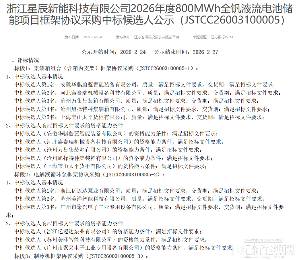 2月24日,浙江星辰新能科技有限公司2026年度800MWh全钒液流电池储能项目框架协议采购中标候选人公示。