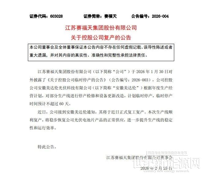 2月25日,江苏赛福天集团股份有限公司发布公司复产的公告。公告称,近日,公司接到安徽美达伦通知,其将于近日正式复工复产。本次生产线顺利复产,将稳步恢复公司光伏电池片产品的正常供应,进一步提升生产线的稳定性和运行效率。