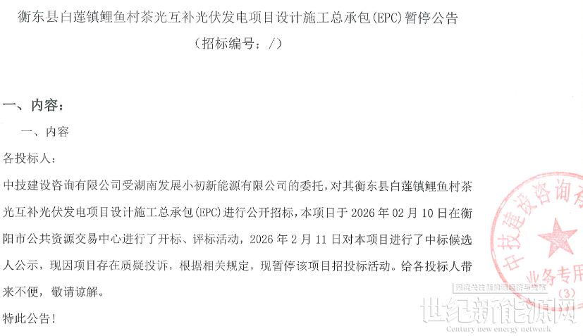 2月26日,衡东县白莲镇鲤鱼村茶光互补光伏发电项目设计施工总承包(EPC)暂停公告公布,现因项目存在质疑投诉,根据相关规定,现暂停该项目招投标活动。