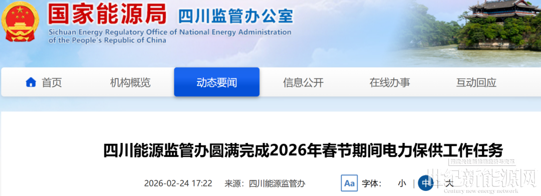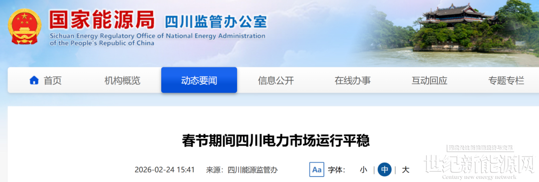 2月24日,国家能源局四川监管办发布动态要闻,春节期间,四川电力市场运行平稳有序,电力供应充足可靠,电力市场供需总体宽松,现货市场运行规范有序,未发生电力安全生产事故事件、未发生重大停限电事件、未出现因民生用能问题引发的重大舆情事件,电力保供各项工作任务圆满完成。