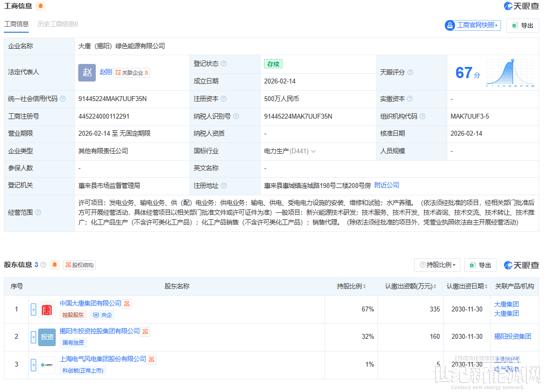近日,大唐(揭阳)绿色能源有限公司成立,法定代表人为赵刚,经营范围包含:发电业务、输电业务、供(配)电业务;供电业务;新兴能源技术研发等。