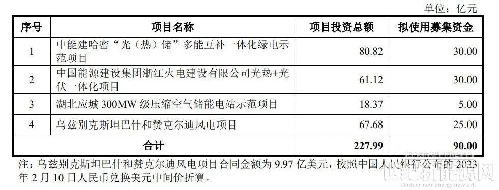 2月27日,中国能建发布《中国能源建设股份有限公司2023年度向特定对象发行A股股票募集说明书(注册稿)》。本次发行的募集资金总额(含发行费用)不超过90.00亿元(含90.00亿元)。募集资金拟投资于中能建哈密“光(热)储”多能互补一体化绿电示范项目、中国能源建设集团浙江火电建设有限公司光热+光伏一体化项目、湖北应城300MW级压缩空气储能电站示范项目和乌兹别克斯坦巴什和赞克尔迪风电项目。