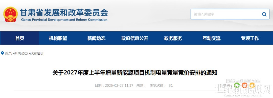 2月27日,甘肃省发展和改革委员会发布《关于2027年度上半年增量新能源项目机制电量竞量竞价安排的通知》。