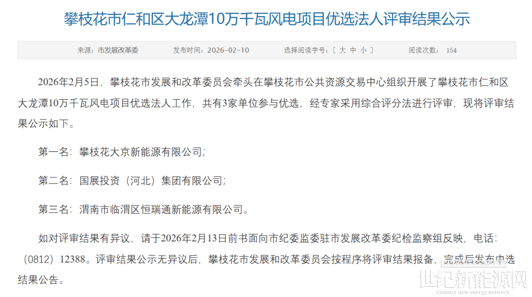 2月10日,四川攀枝花市仁和区大龙潭10万千瓦风电项目优选法人评审结果公示。根据公示,评选第一名为攀枝花大京新能源有限公司,为江苏大京投资控股集团有限公司子公司。