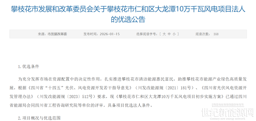 优选公告指出,攀枝花市仁和区大龙潭10万千瓦风电项目位于攀枝花市仁和区大龙潭彝族乡,项目规模10万千瓦。