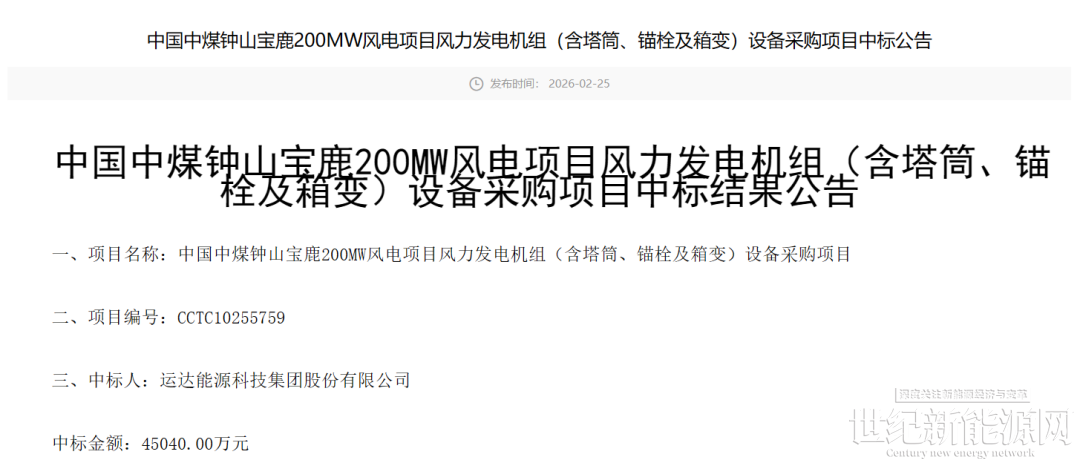 近日,中煤招标与采购网发布《中国中煤钟山宝鹿200MW风电项目风力发电机组(含塔筒、锚栓及箱变)设备采购项目中标结果公告》。公告显示,运达能源科技集团股份有限公司成功中标该项目,中标金额为45040万元。