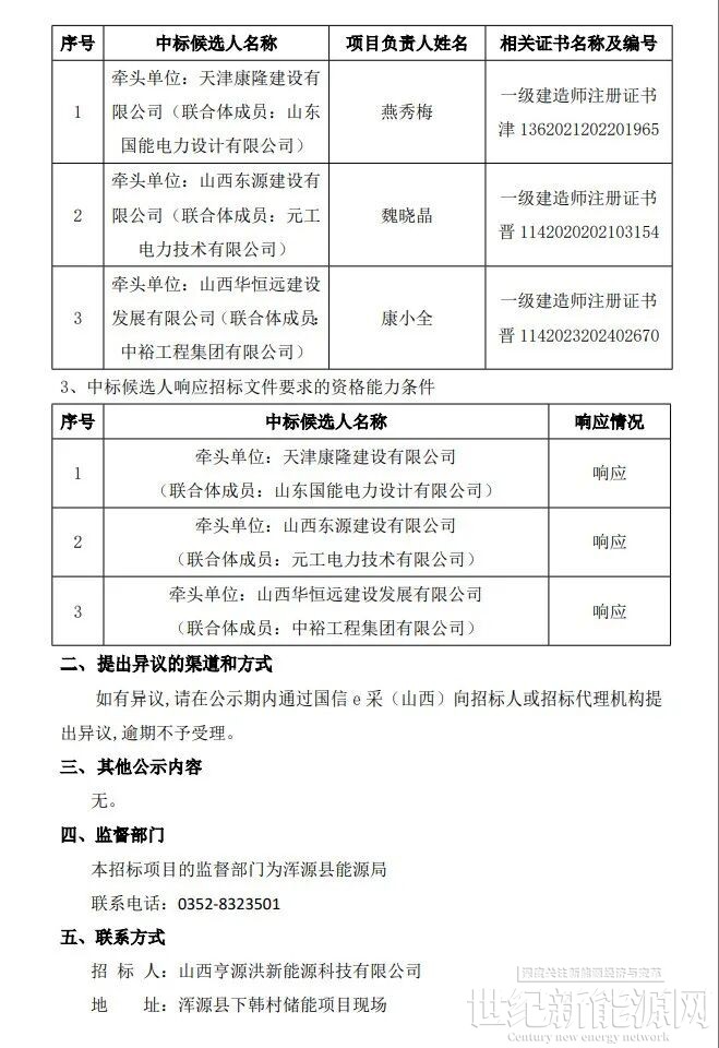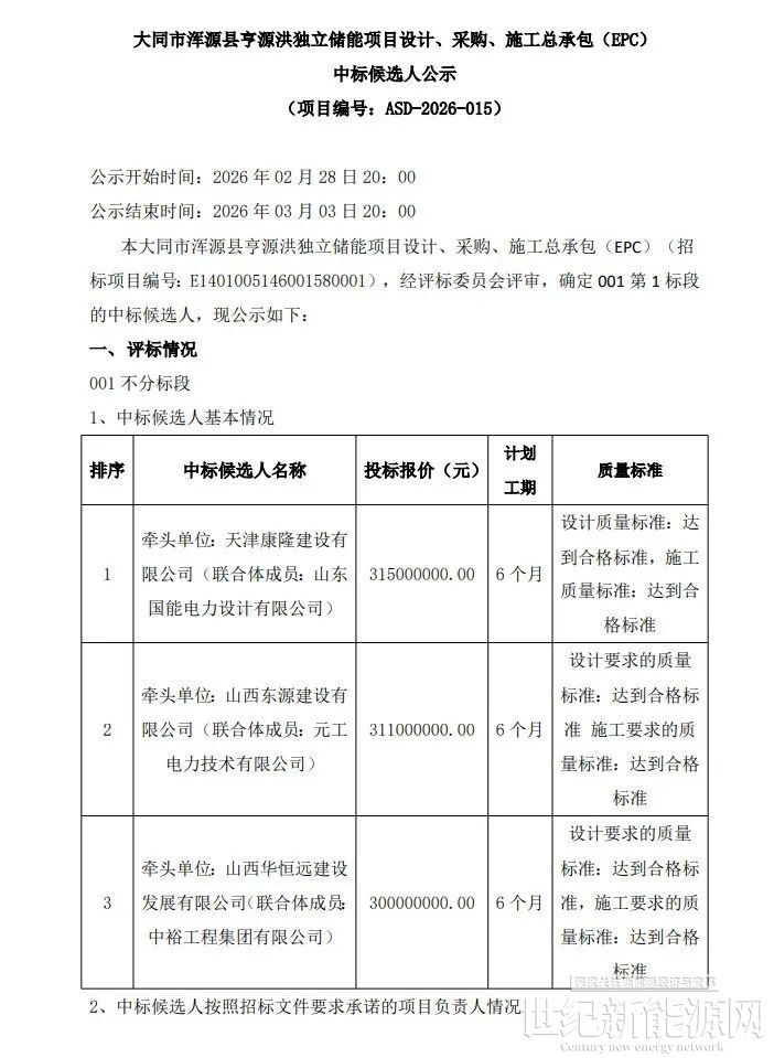 2月28日,大同市浑源县亨源洪独立储能项目设计、采购、施工总承包(EPC)中标候选人公示。
