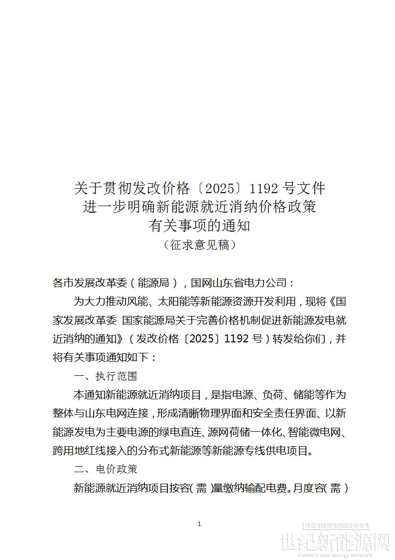 2月28日,山东省发改委发布关于公开征求《关于贯彻发改价格〔2025〕1192号文件进一步明确新能源就近消纳价格政策有关事项的通知(征求意见函)》意见建议的公告。