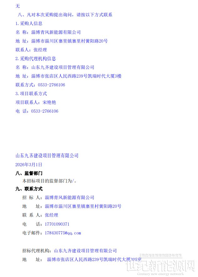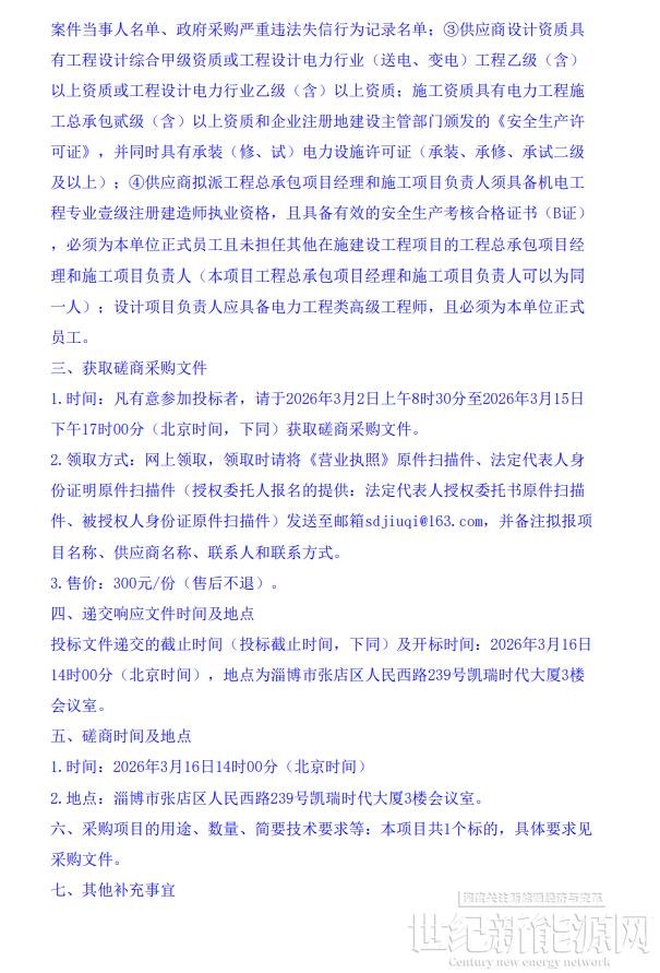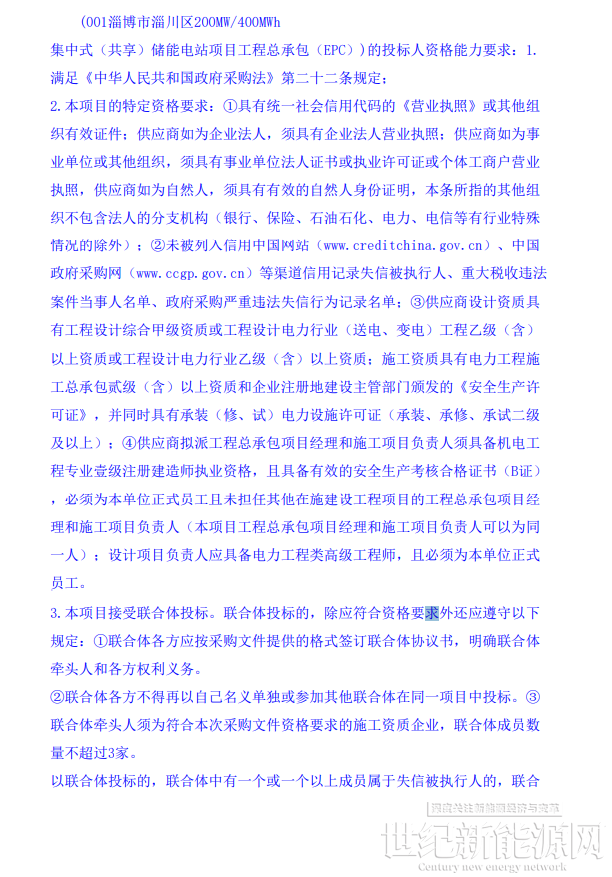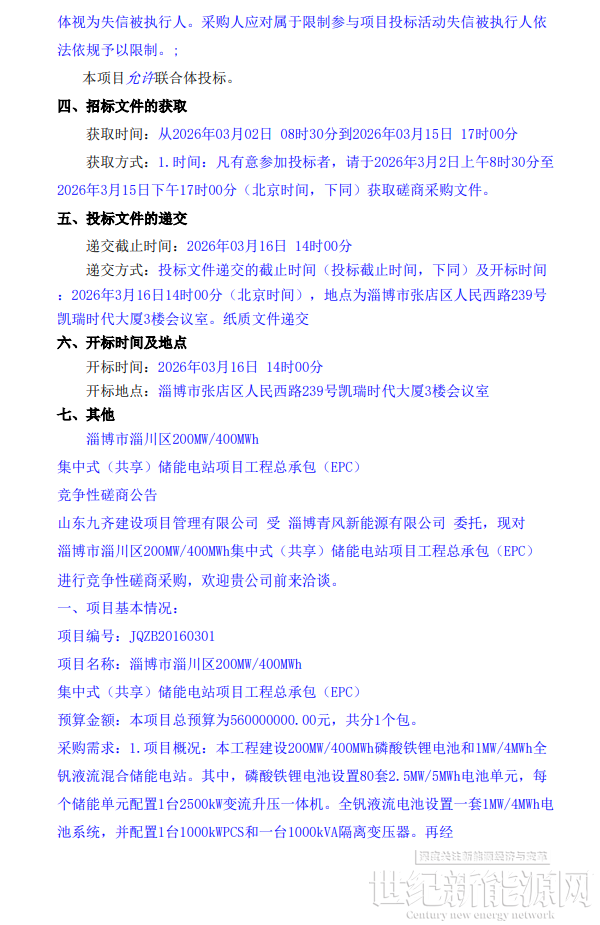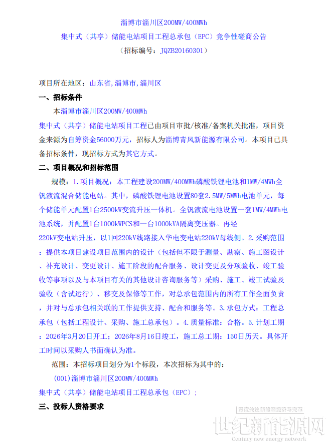 近日,淄博市淄川区200MW/400MWh集中式(共享)储能电站项目工程总承包(EPC)竞争性磋商招标公告发布,该项目资金来源为自筹资金56000万元,招标人为淄博青风新能源有限公司。