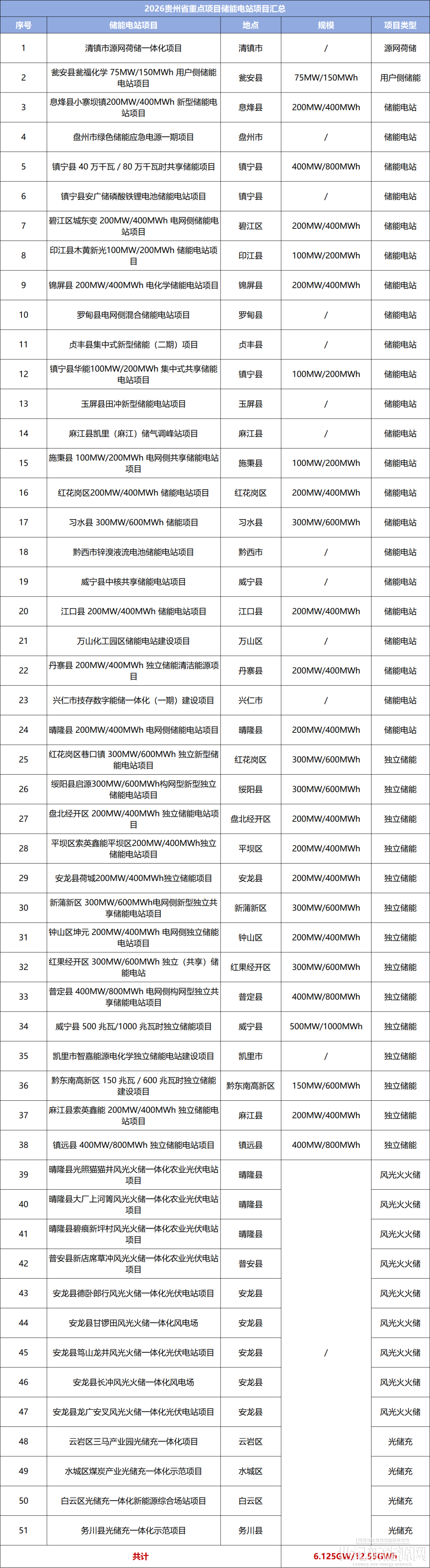 其中涵盖51个储能电站项目,仅26个项目公布建设规模,共计6.125GW/12.55GWh。