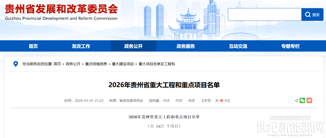 3月1日,贵州省发展和改革委员会发布《2026年贵州省重大工程和重点项目名单》,共安排重大项目3427个,涵盖重大工程与重点项目两大类别。