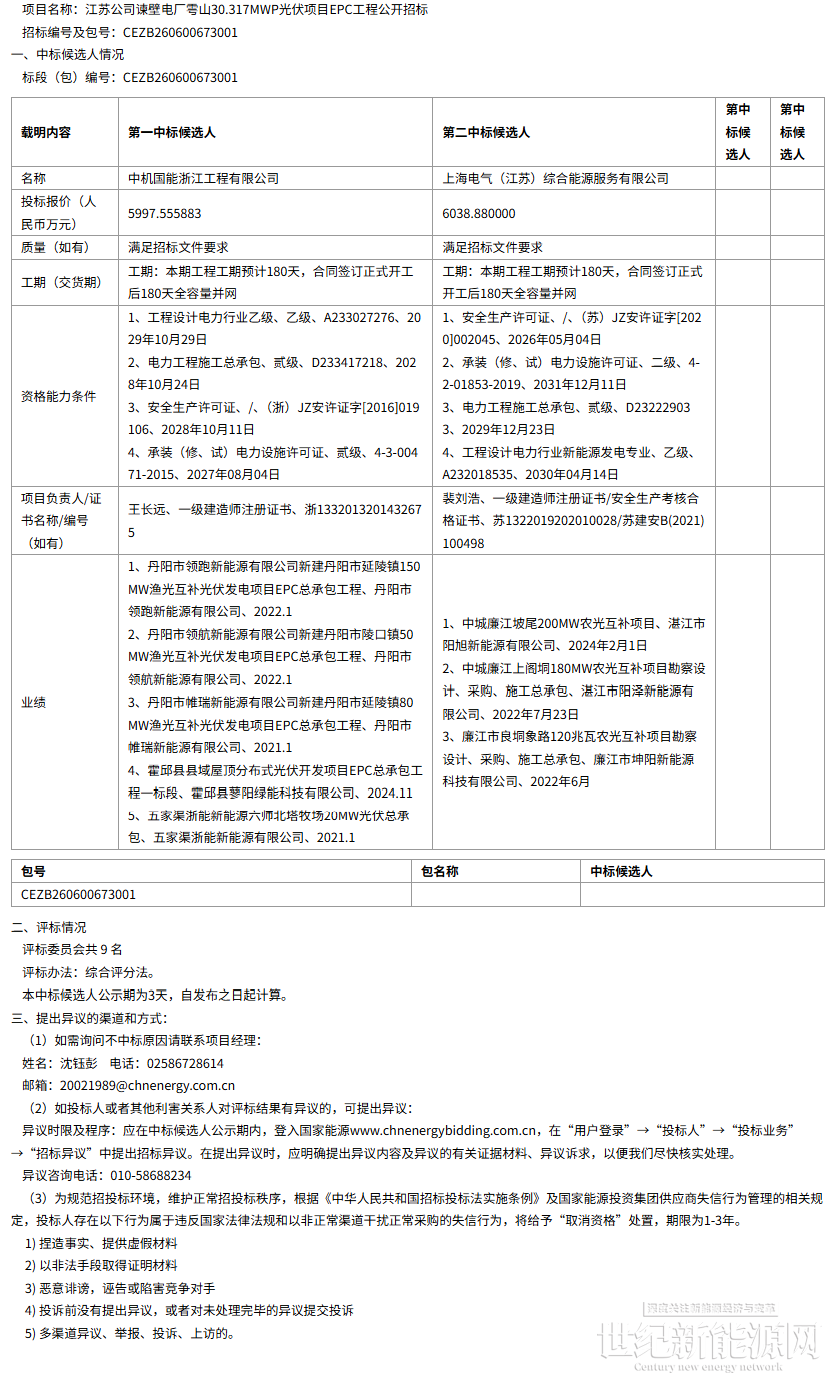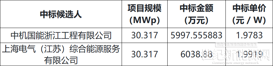 3月3日,江苏公司谏壁电厂雩山30.317MWP光伏项目EPC工程公开招标中标候选人公示。招标人为国家能源集团谏壁发电厂。其中:中机国能浙江工程有限公司为第一候选人,中标报价5997.555883万元,中标单价1.98元/W。
