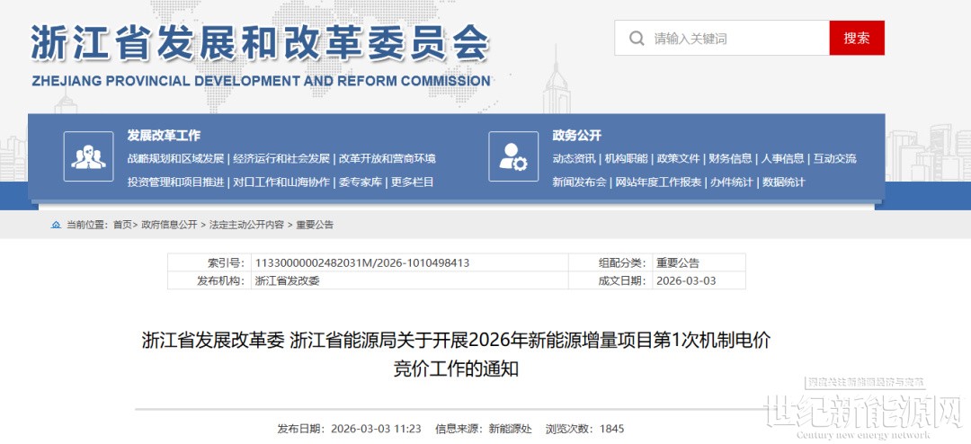 3月3日,浙江省发展改革委、浙江省能源局发布《关于开展2026年新能源增量项目第1次机制电价竞价工作的通知》。