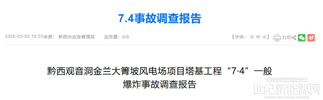 经调查认定,黔西观音洞金兰大箐坡风电场项目塔基工程“7·4”一般爆炸事故是一起因施工方未上报审核同意、改变专项施工方案中确定的人工挖掘方法,采用致裂管活化剂爆裂开挖基坑,施工现场安全管理缺失,监理单位履职不力,行业部门监管不到位导致的一般生产安全责任事故。