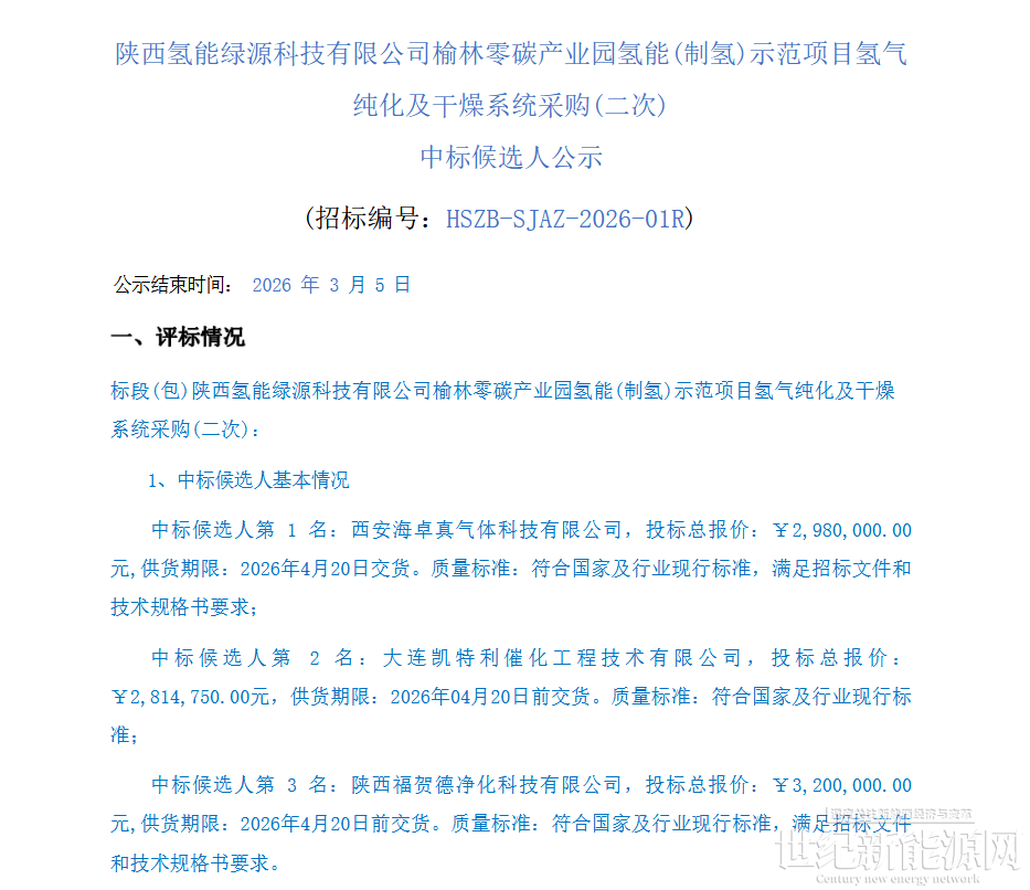 3月3日,陕西氢能绿源科技有限公司榆林零碳产业园氢能(制氢)示范项目氢气纯化及干燥系统采购(二次)中标候选人公示。
