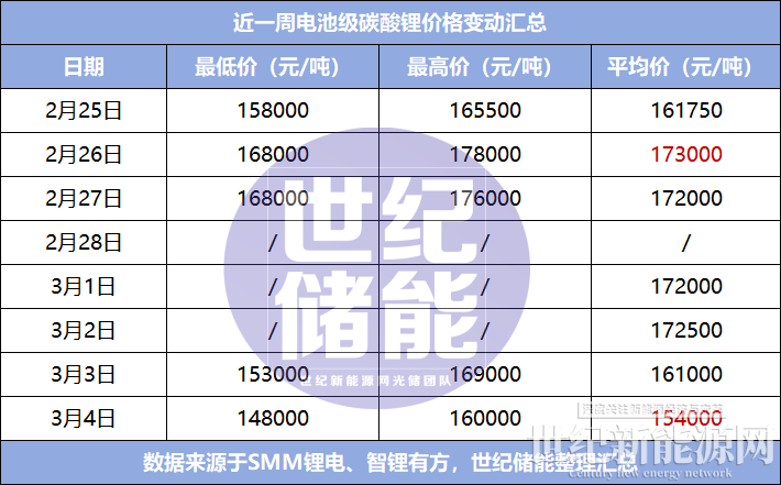 3月3日,碳酸锂期货主力合约大跌12.99%,早盘15.09万元/吨;现货方面电池级碳酸锂价格下跌1.15万元,报16.1万元/吨。3月4日,价格继续下探,电池级碳酸锂均价报15.4万元/吨,接连两日已猛跌1.85万元。