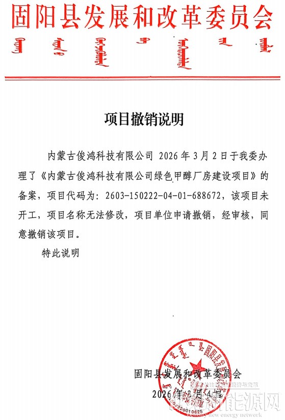 公告称,内蒙古俊鸿科技有限公司2026年3月2日于固阳县发展和改革委员会办理了《内蒙古俊鸿科技有限公司绿色甲醇厂房建设项目》的备案,项目代码为:2603-150222-04-01-688672,该项目未开工,项目名称无法修改,项目单位申请撤销,经审核,同意撤销该项目。
