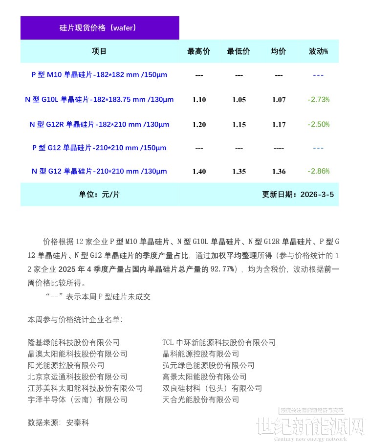 据安泰科统计,本周硅片价格延续下行态势。其中,N型G10L单晶硅片(182*183.75mm/130μm)成交均价在1.07元/片,环比上周下跌2.73%;N型G12R单晶硅片(182*210mm/130μm)成交均价在1.17元/片,环比上周下跌2.50%;N型G12单晶硅片(210*210 mm/130μm)成交均价在1.36元/片,环比上周下跌2.86%。据调研了解,本周下游电池片、组件价格暂无明显变化,较上周持平,其中电池片主流价格0.41-0.45元/W,组件主流价格0.71-0.75元/W。