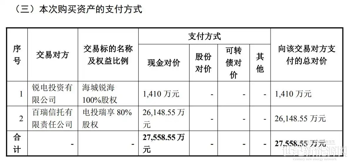 3月4日,东方新能披露重大资产购买报告书(草案),公司计划通过现金支付方式收购海城锐海新能风力发电有限公司(简称“海城锐海”)100%股权和北京电投瑞享新能源发展有限公司(简称“电投瑞享”)80%股权,交易总价格(不含募集配套资金金额)为2.76亿元。