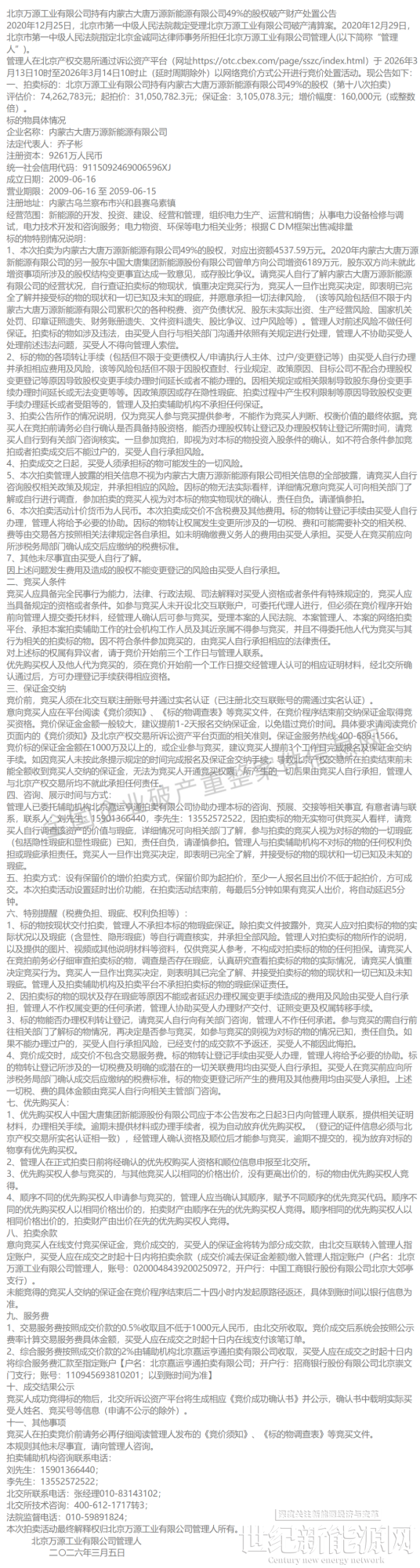 3月5日,北京万源工业有限公司持有内蒙古大唐万源新能源有限公司49%的股权破产财产处置公告发布。