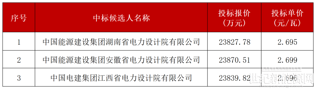 根据公示内容显示,此次共有3位候选人入围,分别为中国能建和中国电建集团旗下,投标单价在2.695-2.699元/W。具体如下表: