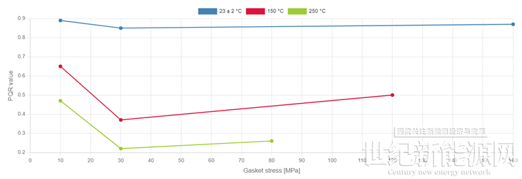 碱性电解槽运营时需要每日开启,存在压力循环和温度循环。密封垫片长期使用的可靠性需要综合考虑密封性和应力松弛。PQR 松弛因子为稳定状态时(垫片充分蠕变后)的垫片表面应力与安装阶段初始应力的比例。这个松弛因子越接近1(=100%)代表垫片的蠕变越低性能越优异。测试时关键的参数包括垫片厚度、面压和温度。温度越高,垫片 PQR 更低,垫片更容易松弛。测试面压QSmax越高,垫片更能抗松弛,在操作温度下垫片保持刚性要求时能达到的最大载荷越大则垫片越能抗松弛。GYLON®3510松弛数据非常齐全,测试最高温度250℃,也有常温和150℃的数据。其在面压10MPa和30MPa及更高的面压下均有松弛因子数据供电解槽厂家根据使用工况参考。