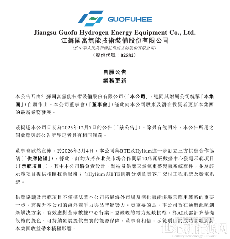 近日,国富氢能发布公告称,于2026年3月4日,公司与BTE及Hylium进一步订立三方供应合作协议,据此,订约方将在北美市场合作开展10兆瓦级数据中心发电示范项目("示范项目"),其中公司将负责设计、制造及供应天然气重整制氢系统套件,并为该示范项目提供相关技术服务;而Hylium与BTE则将分别负责客户交付工程系统及发电系统。