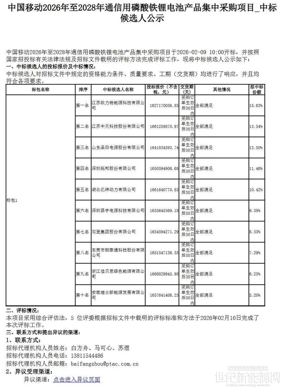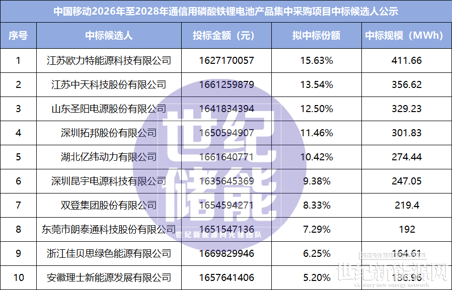 近日,中国移动2026年至2028年通信用磷酸铁锂电池产品集中采购项目中标候选人公示,共吸引包括中天科技、圣阳电源、亿纬动力、昆宇电源、双登集团等10家企业入围,其中标份额各不相同。