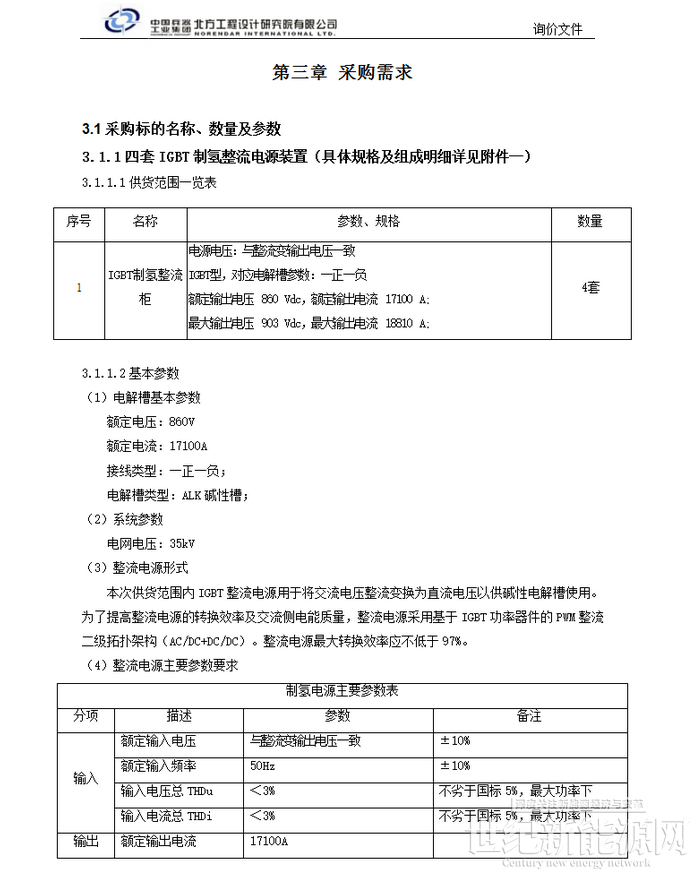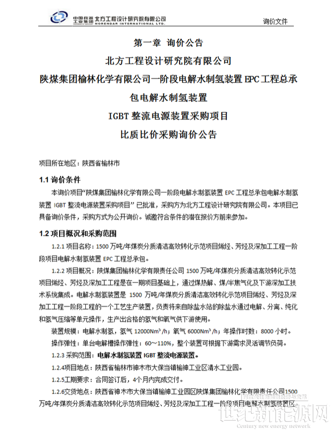 近日,北方工程设计研究院有限公司陕煤集团榆林化学有限公司一阶段电解水制氢装置EPC工程总承包电解水制氢装置IGBT整流电源装置采购公告发布。