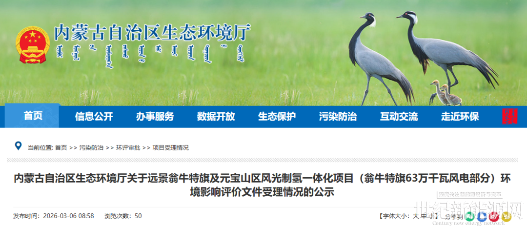 3月6日,内蒙古远景翁牛特旗及元宝山区风光制氢一体化项目(翁牛特旗63万千瓦风电部分)环评受理公示。