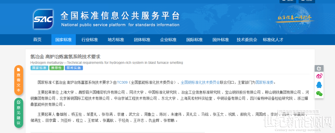 近日,国家标准《氢冶金 高炉冶炼富氢系统技术要求》(标准号:GB/T 47039-2026)在全国标准信息公共服务平台发布,实施日期为2026年5月1日。该标准为首次发布,归口单位为全国氢能标准化技术委员会和全国钢标准化技术委员会,主要起草单位:上海大学、昌黎县兴国精密机件有限公司、同济大学、中国标准化研究院、冶金工业信息标准研究院、宝山钢铁股份有限公司、鞍山钢铁集团有限公司、河钢集团有限公司、北京首钢国际工程技术有限公司、中冶京诚工程技术有限公司、东北大学、上海吴淞材料实验室、中钢设备有限公司、四川省特种设备检验研究院、浙江耀鼎氢能科技有限公司。