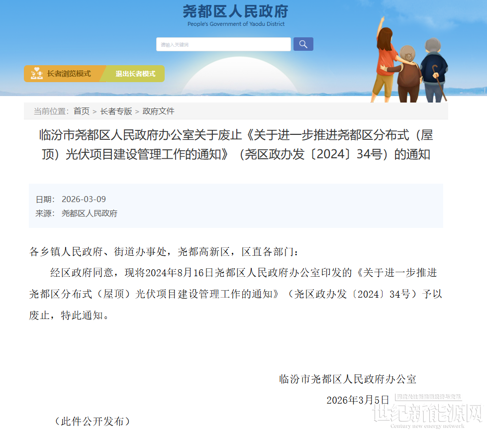 3月9日,山西临汾市尧都区人民政府办公室发布关于废止《关于进一步推进尧都区分布式(屋顶)光伏项目建设管理工作的通知》,通知表示,经区政府同意,现将2024年8月16日尧都区人民政府办公室印发的《关于进一步推进尧都区分布式(屋顶)光伏项目建设管理工作的通知》(尧区政办发〔2024〕34号)予以废止,特此通知。