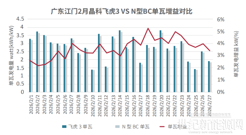 1、广东江门彩钢瓦屋顶电站实证项目于2026年2月1日至2026年2月27日完成发电量对比测试。实测数据显示,测试周期内晶科飞虎3组件单瓦累计发电量达76.17 kWh/kW,同功率N型BC组件为73.53 kWh/kW,飞虎3实现3.58%的稳定单瓦发电增益。