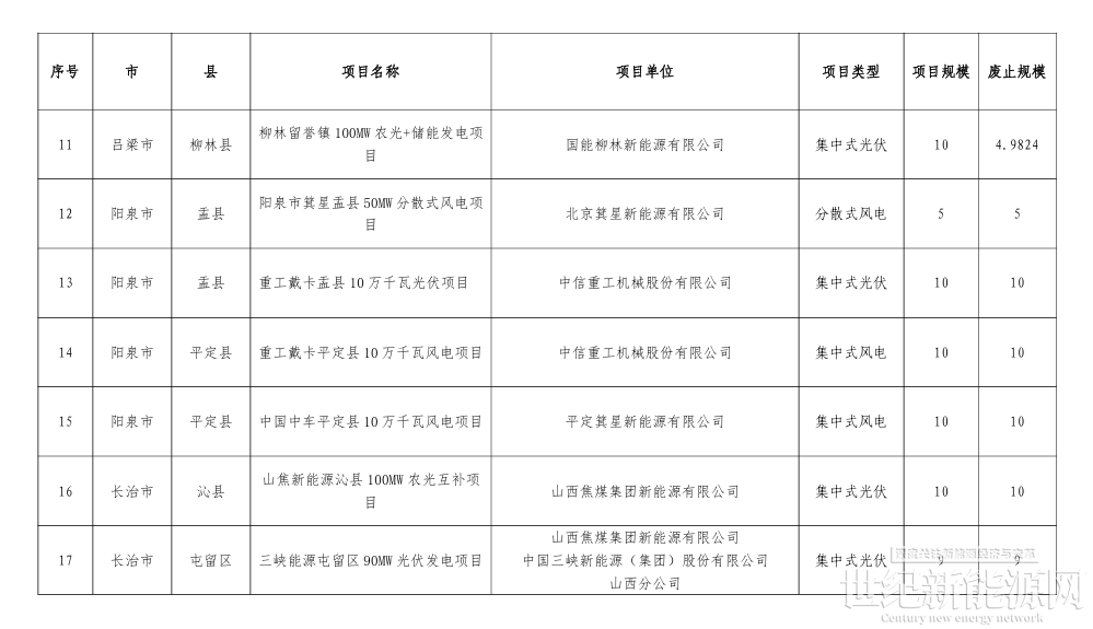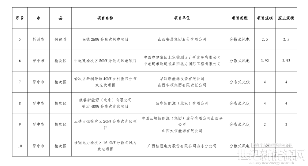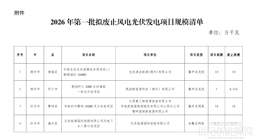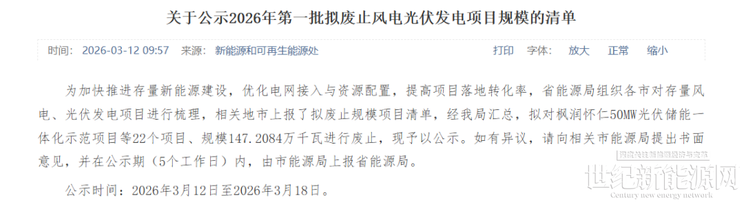 3月12日,山西省能源局公示2026年第一批拟废止风电光伏发电项目规模的清单,拟对枫润怀仁50MW光伏储能一体化示范项目等22个项目、规模147.2084万千瓦进行废止。其中,分散式风电项目5个,规模14.61万千瓦;集中式风电项目4个,规模38万千瓦。