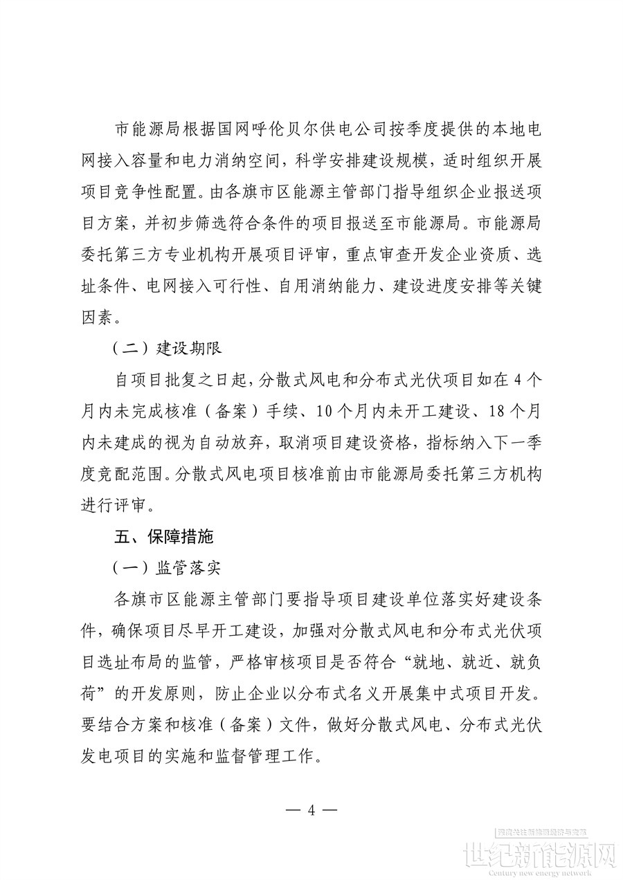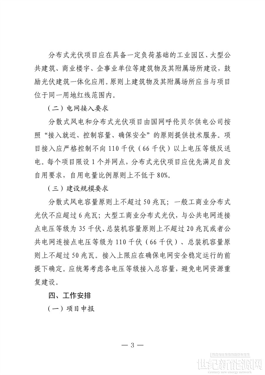 分散式风电和分布式光伏项目由国网呼伦贝尔供电公司按照“接入就近、控制容量、确保安全”的原则提供技术服务。项目接入应严格控制不向110千伏(66 千伏)以上电压等级反送电。每个项目限设1个并网点,分布式光伏项目应优先满足自发自用要求,自用电量比例原则上不低于80%。