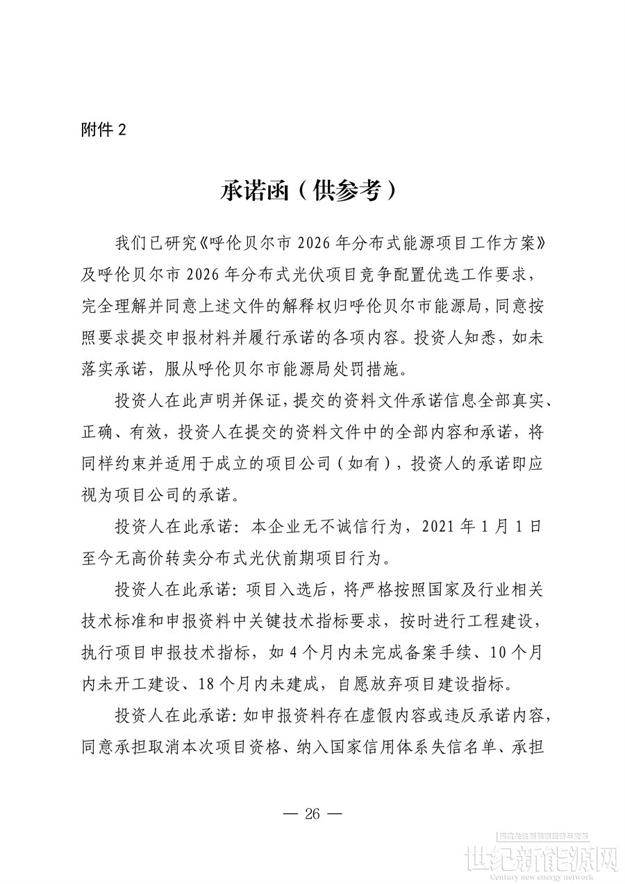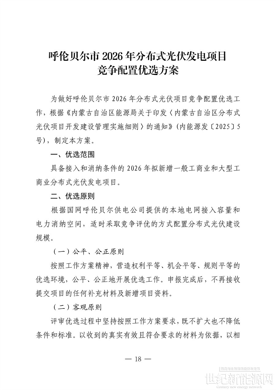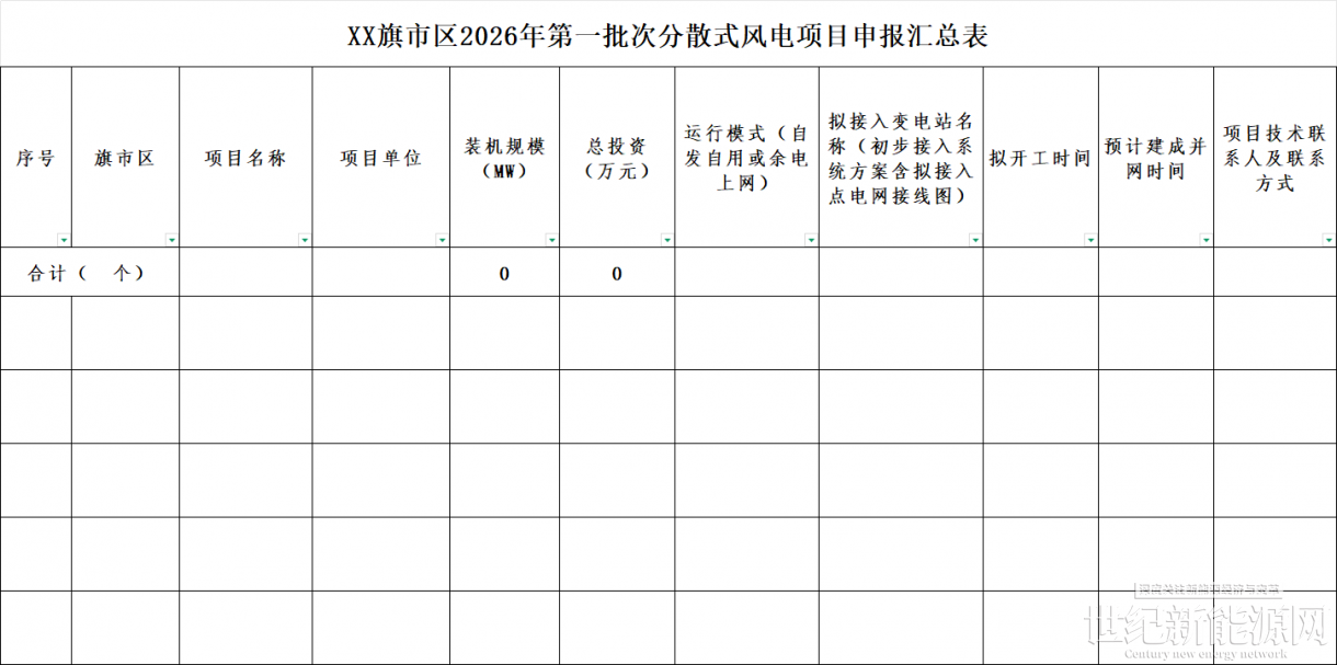 为推进呼伦贝尔市分散式风电,分布式光伏发电项目高质量发展,市能源局研究制定了《呼伦贝尔市2026年分布式能源工作方案》,现印发给你们。请认真按照方案要求,组织本地区企业开展申报工作。2026年第一批次申报于本月开展,第一批次申报截止时间为3月23日,请各旗市区能源主管部门按时将项目申报汇总表和申报材料报送至市能源局。
