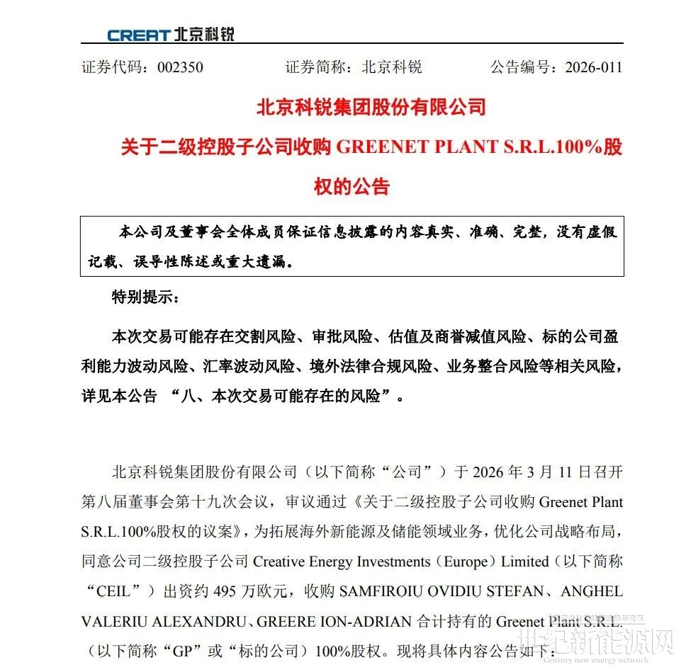 近日,北京科锐集团股份有限公司披露《关于二级控股子公司收购Greenet Plant S.R.L.100%股权的议案》《关于投资建设罗马尼亚瓦尔恰99MW/198MWh储能项目的议案》,以收购为前提,投资建设罗马尼亚瓦尔恰99MW/198MWh储能项目,其中收购约495万欧元,项目总投资不超过4281.37万欧元,共计投入4776.37万欧元(约合3.76亿人民币)。