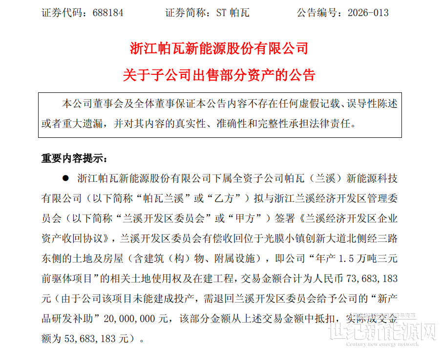 3月14日,ST帕瓦(688184)发布公告,其全资子公司帕瓦(兰溪)新能源科技有限公司拟与浙江兰溪经济开发区管理委员会签署《兰溪经济开发区企业资产收回协议》。